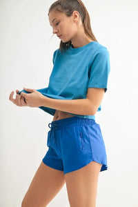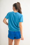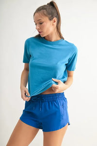 An essential everyday basic casual tee! This blue tee features a ribbed crew neckline, short sleeves, and boxy fit. The pima cotton/spandex blend fabric is lightweight and breathable with just the right amount of stretch.