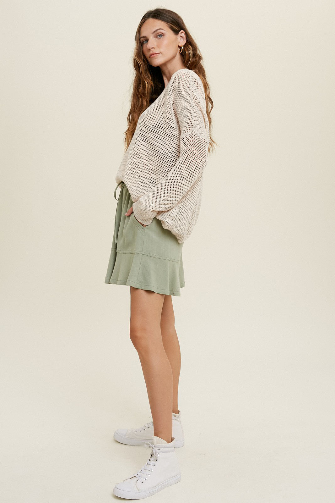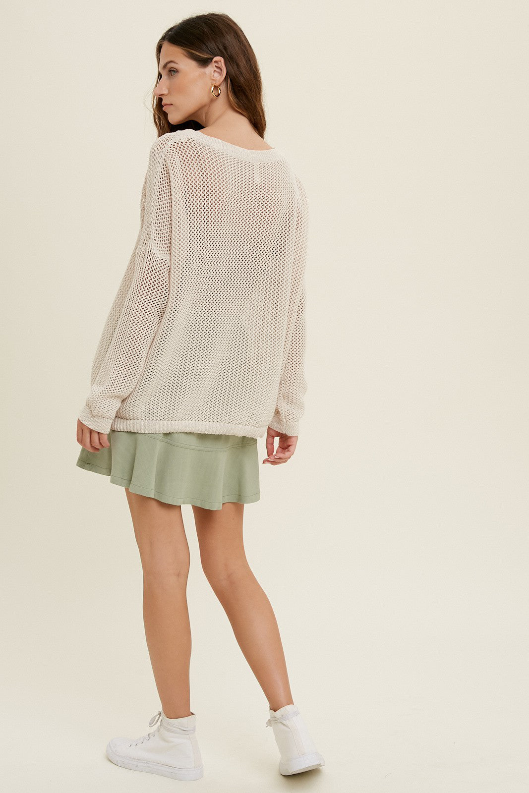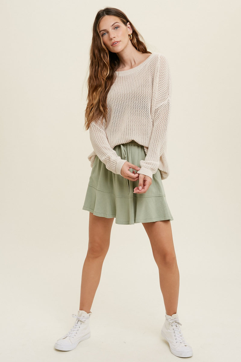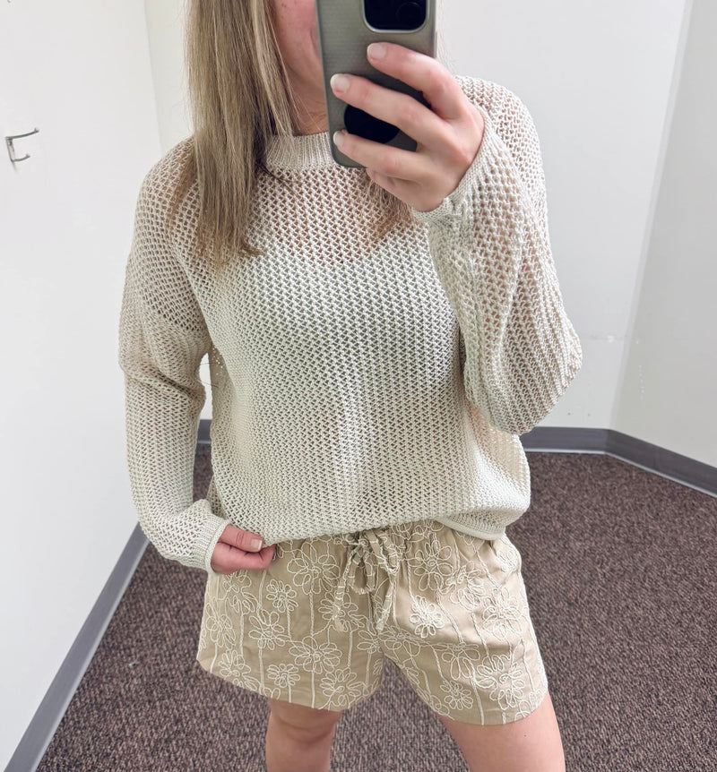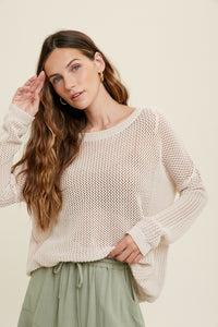 Lightweight, open crochet knit perfect for breezy days when you just need an extra layer.  Featuring a round neckline, long sleeves with drop shoulder, and an open knit for an airy design. The perfect neutral to pair with skirts, jeans, or trousers!