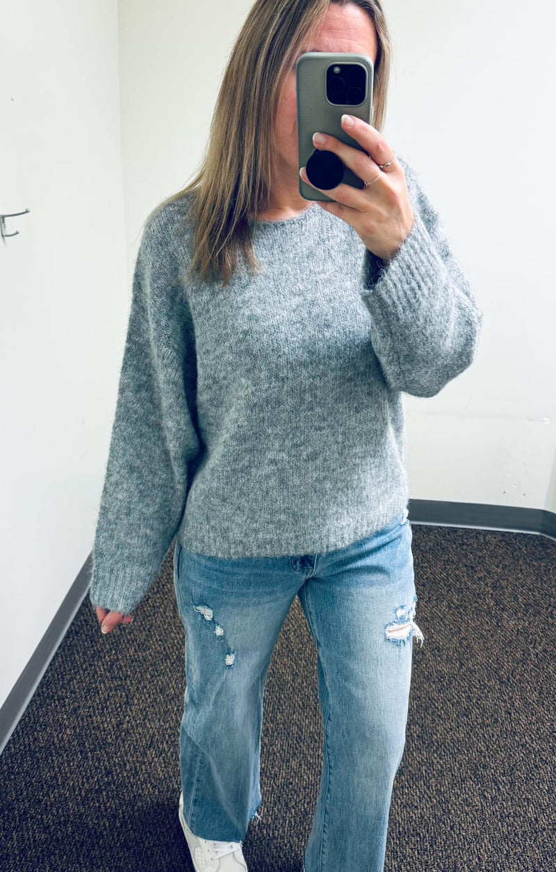 This heather grey knit sweater features a round neckline, drop shoulder, and ribbing at the hem and cuffs. A classic, neutral sweater that will stay relevant in your wardrobe for seasons to come.