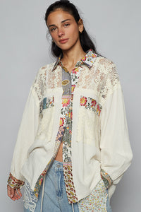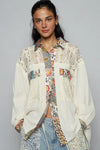 This button up shirt features a double cotton gauze body with patchwork print trim and lace patch textured fabric, button down front, patch pockets, and an oversized fit. Lighter weight. The stunning detail in this bohemian-inspired top will instantly elevate any look!