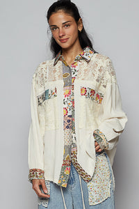 POL Lace Patchwork Floral Trim Long Sleeve Shirt