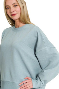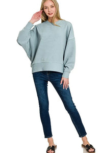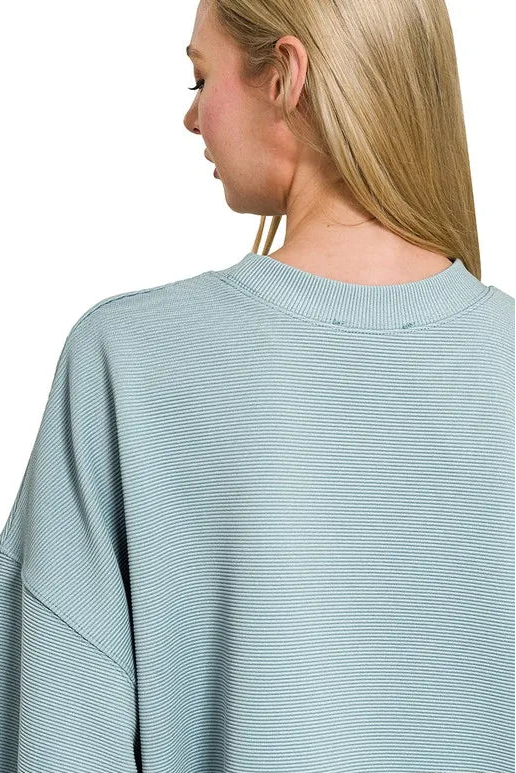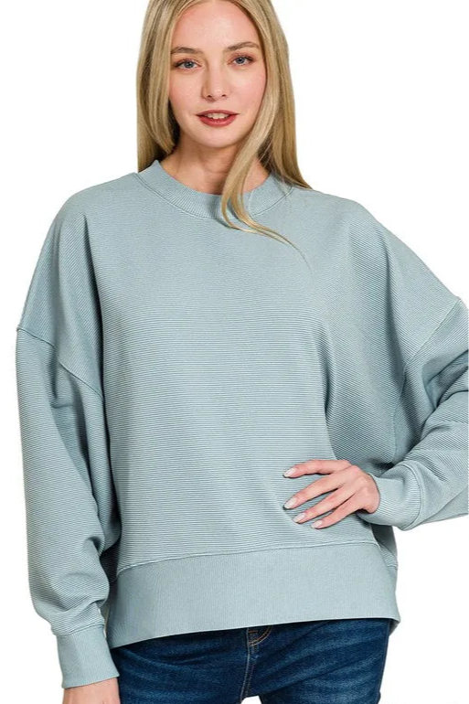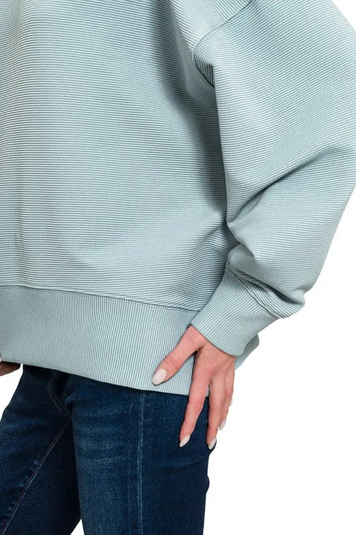 A comfortable everyday pullover crafted from ribbed fabric and designed with a crew neckline, balloon style sleeve, with drop shoulder and a relaxed fit. Ideal for lounging and casual outings.